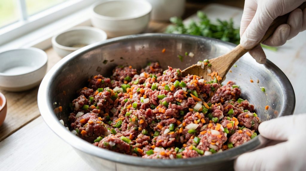 ここが最大のポイントです!生のまま肉に混ぜるのではなく、みじん切りにした野菜に少量の油をまぶして、レンジで加熱(600Wで2分程度)します。こうすることで、野菜の水分が飛んで甘みが凝縮され、肉との馴染みが劇的に良くなるんです。